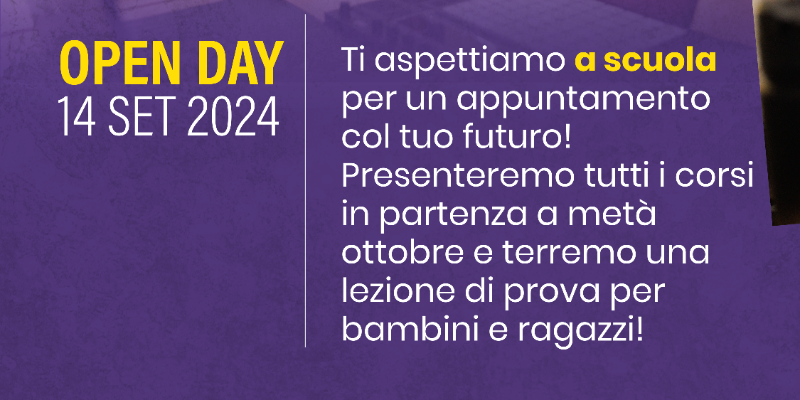 Sabato 14 settembre ti aspettiamo a scuola per un appuntamento col tuo futuro! Presenteremo tutti i corsi in partenza a metà ottobre con il nuovo anno accademico e terremo una lezione di prova per bambini e ragazzi!